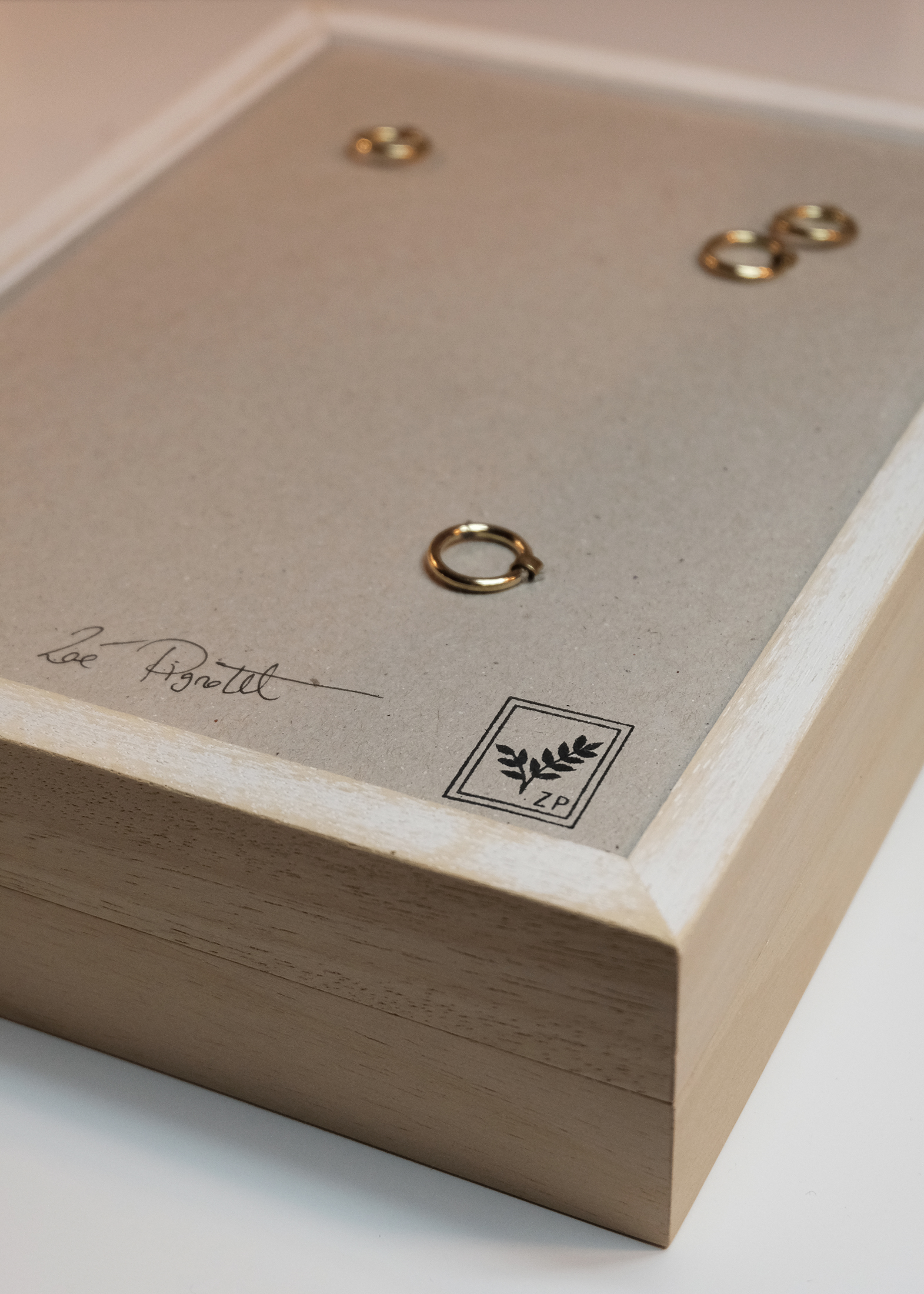 Feuille brodée aux reflets dorés, fleurs de papier colorées à la main, aux couleurs fraîches d’une saison adorée.