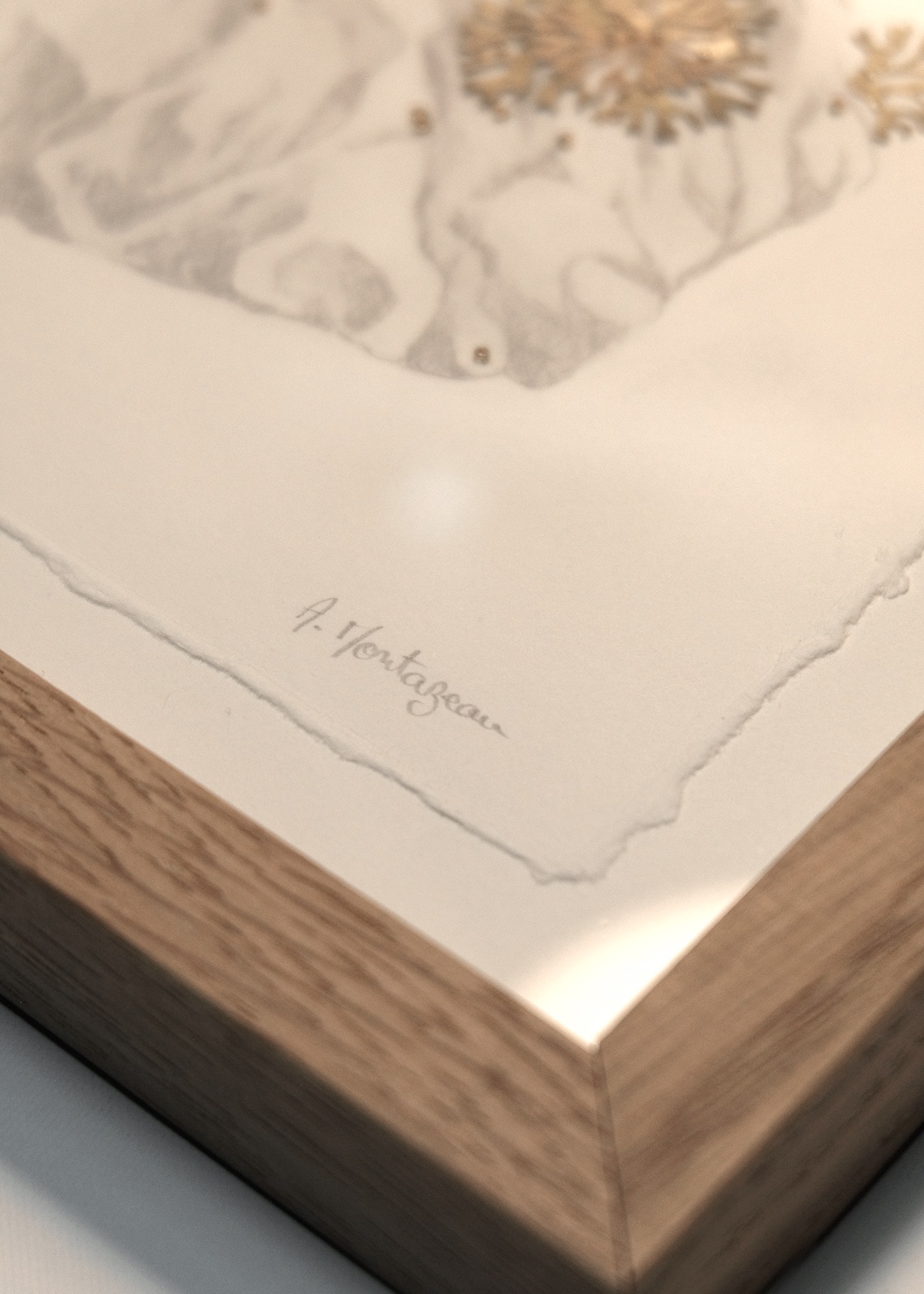 Crayon graphite sur papier Canson par Amandine Montazeau, broderie sur papier, fil métallisé doré, papier, perles par Zoé Pignolet.