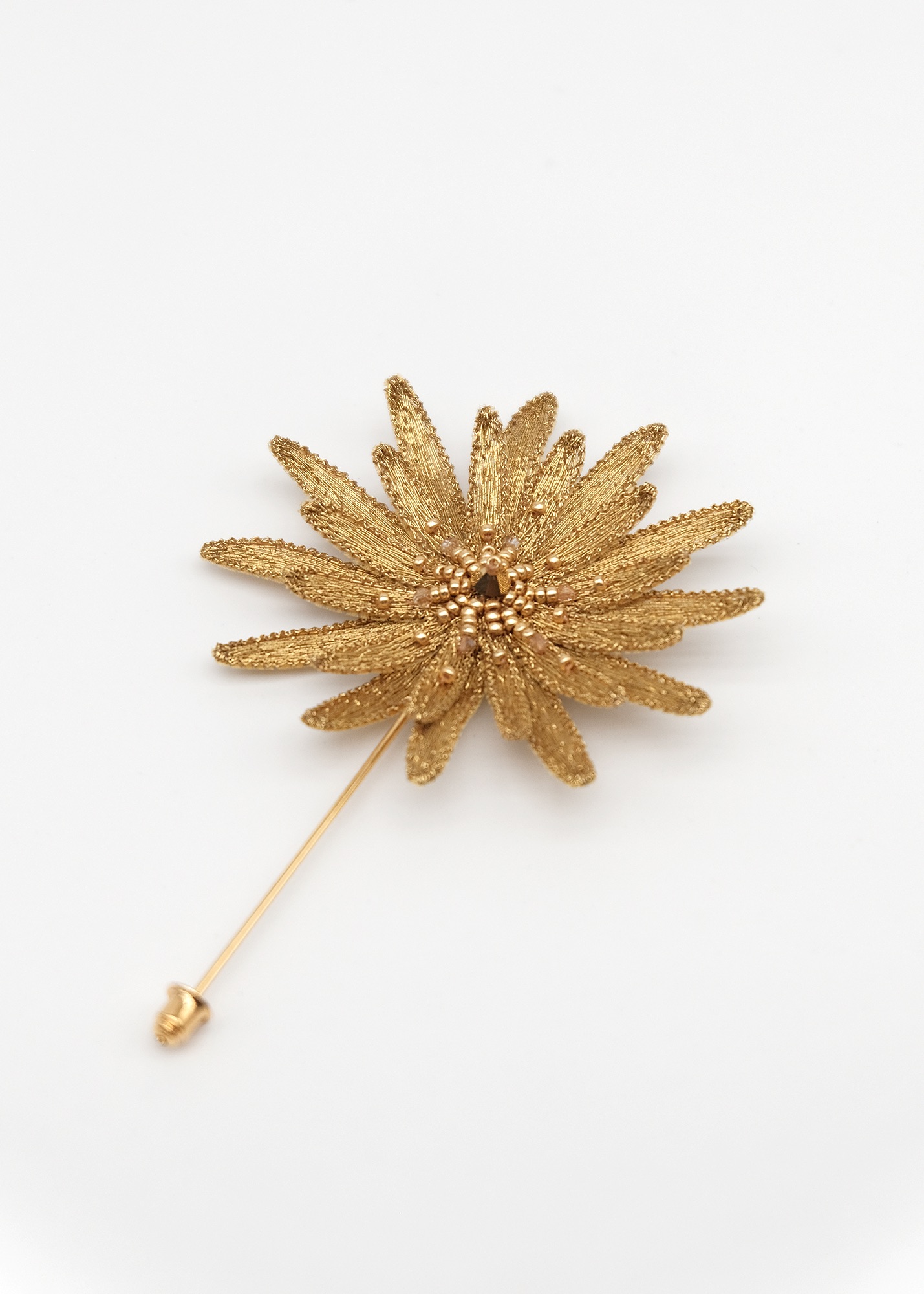 Broche en organza de soie, brodée de fils métallisé doré et de perles, montée sur une fibule.