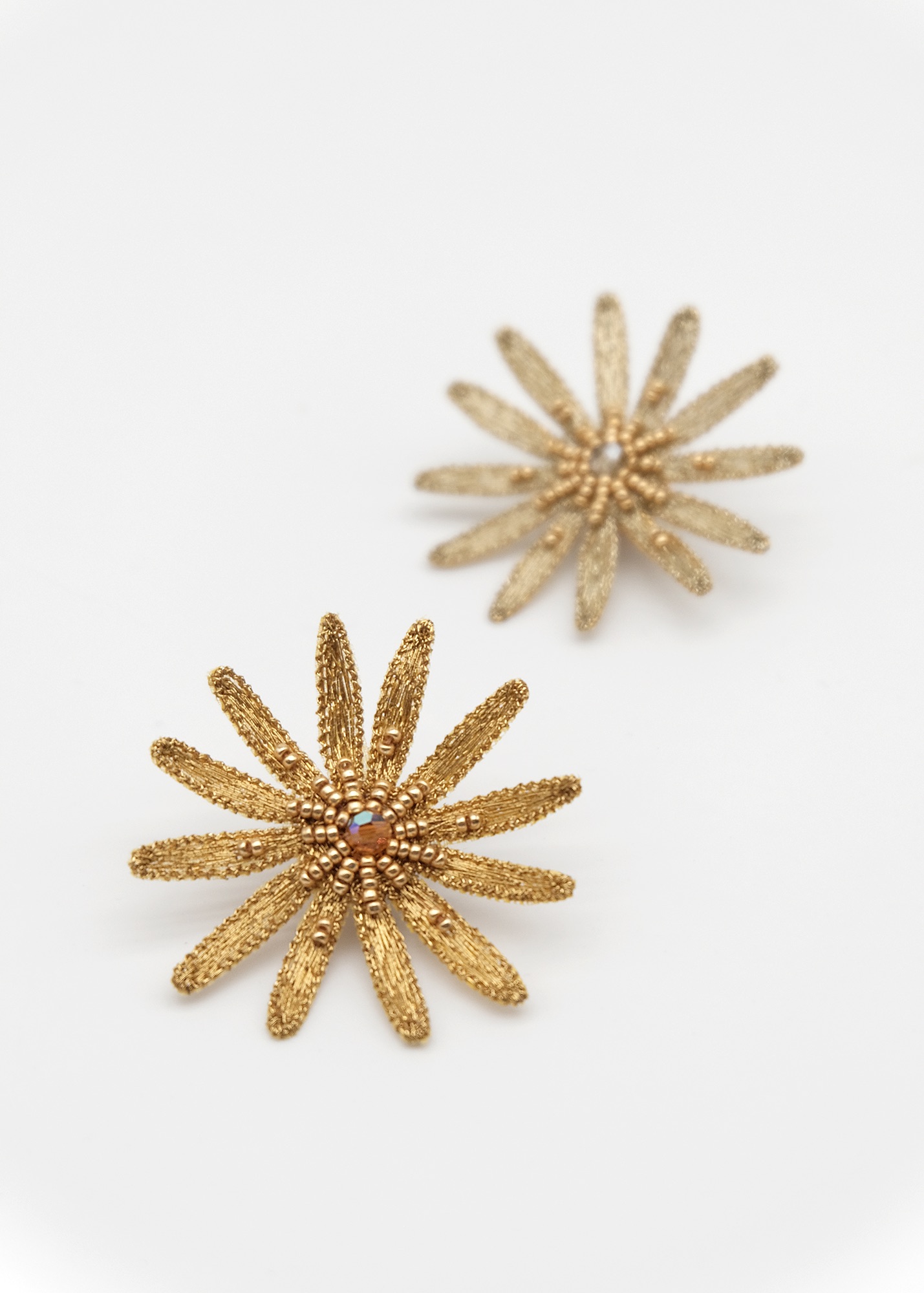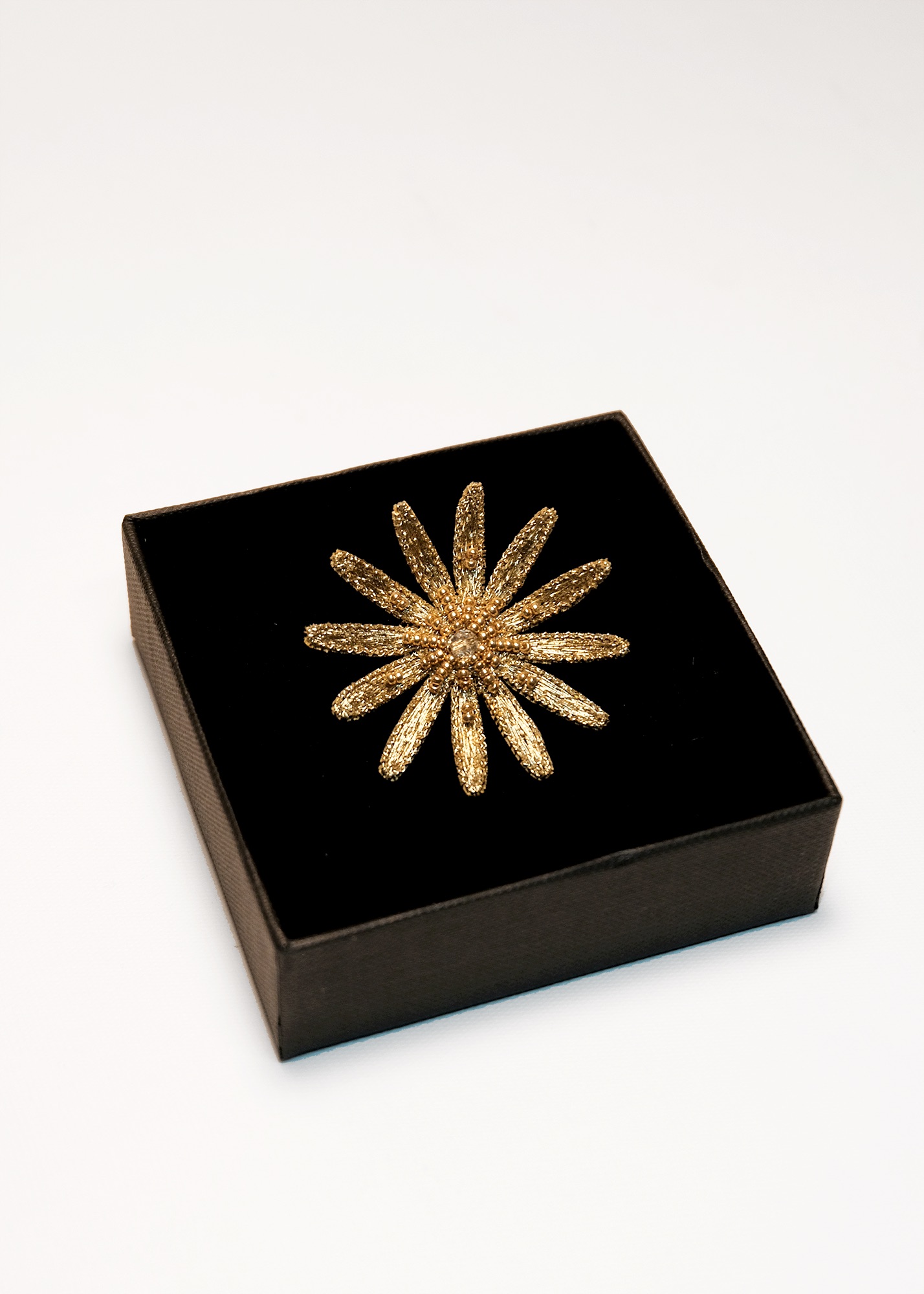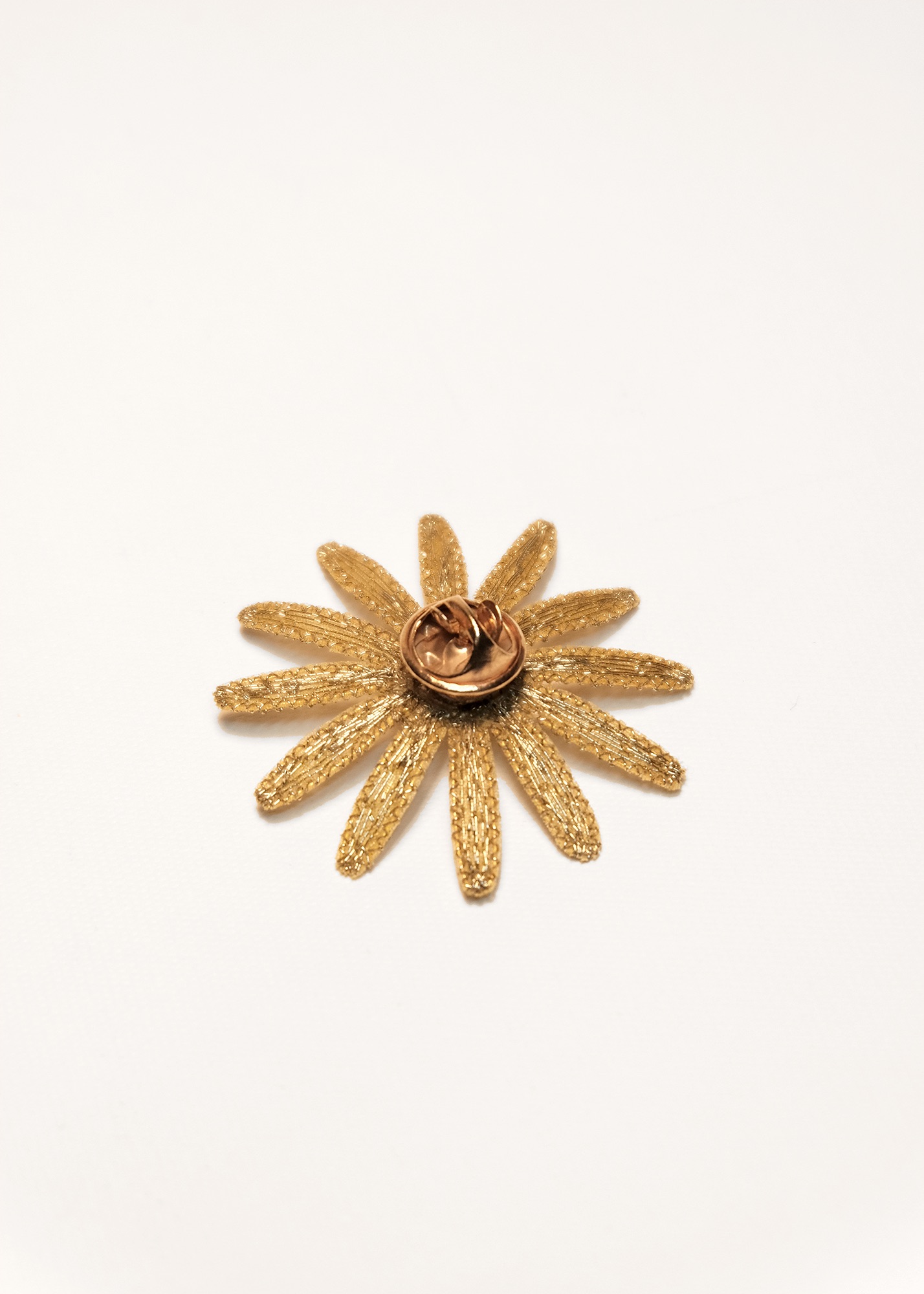 Broche en organza de soie, brodée de fils métallisé doré et de perles, montée sur un pin’s.