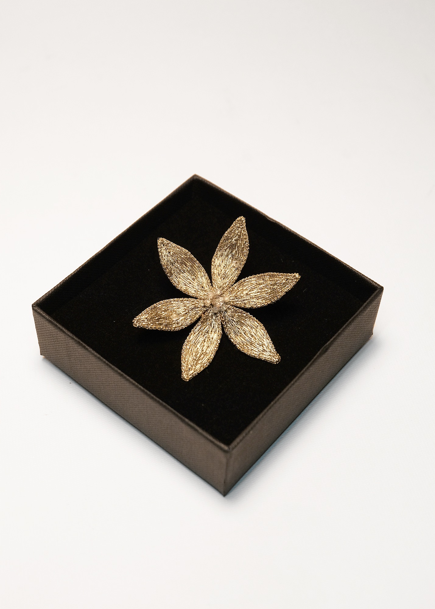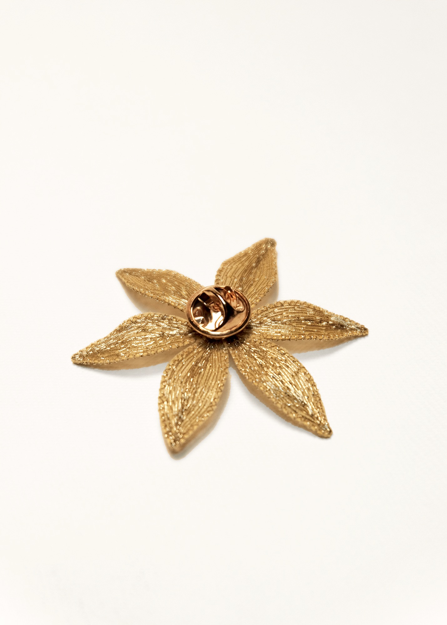 Broche en organza de soie, brodée de fils métallisé doré et de perles, montée sur un pin’s.
