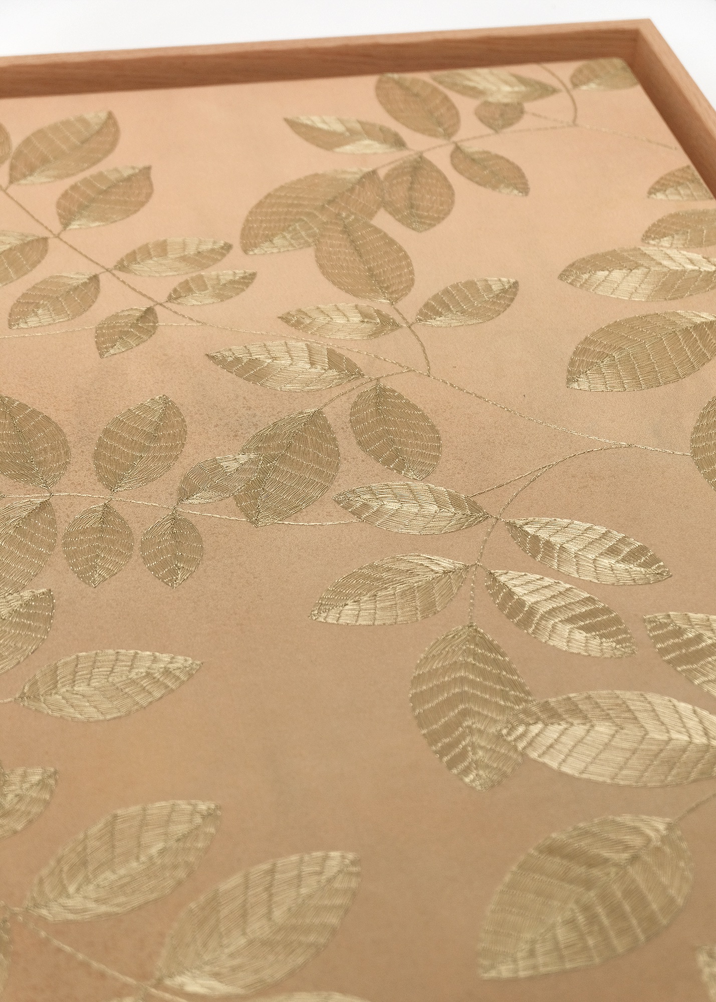 Feuillage en fils métallisé doré. Broderie au crochet de Lunéville.
