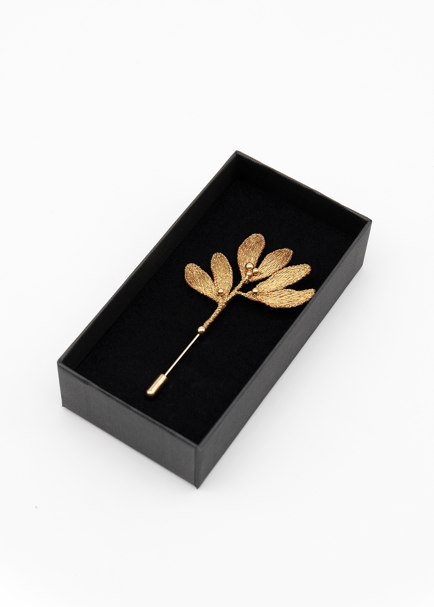 Broche en organza de soie, brodée de fils métallisé doré et de perles, montée sur une fibule.