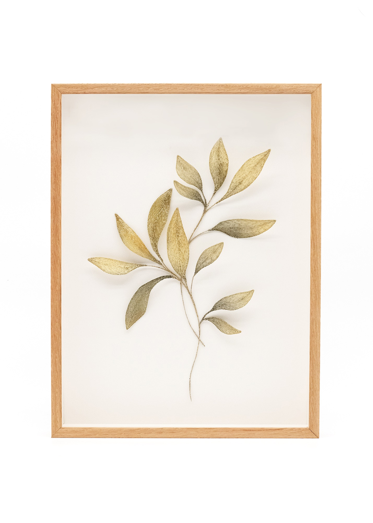 Lisière n°1 évoque un feuillage doré subtilement teinté de vert. Une cueillette lumineuse à l’orée d’un sentier. Cette broderie invite à franchir la frontière d’un territoire encore inconnu mais accueillant, un jour de printemps où la nature s’éveille.