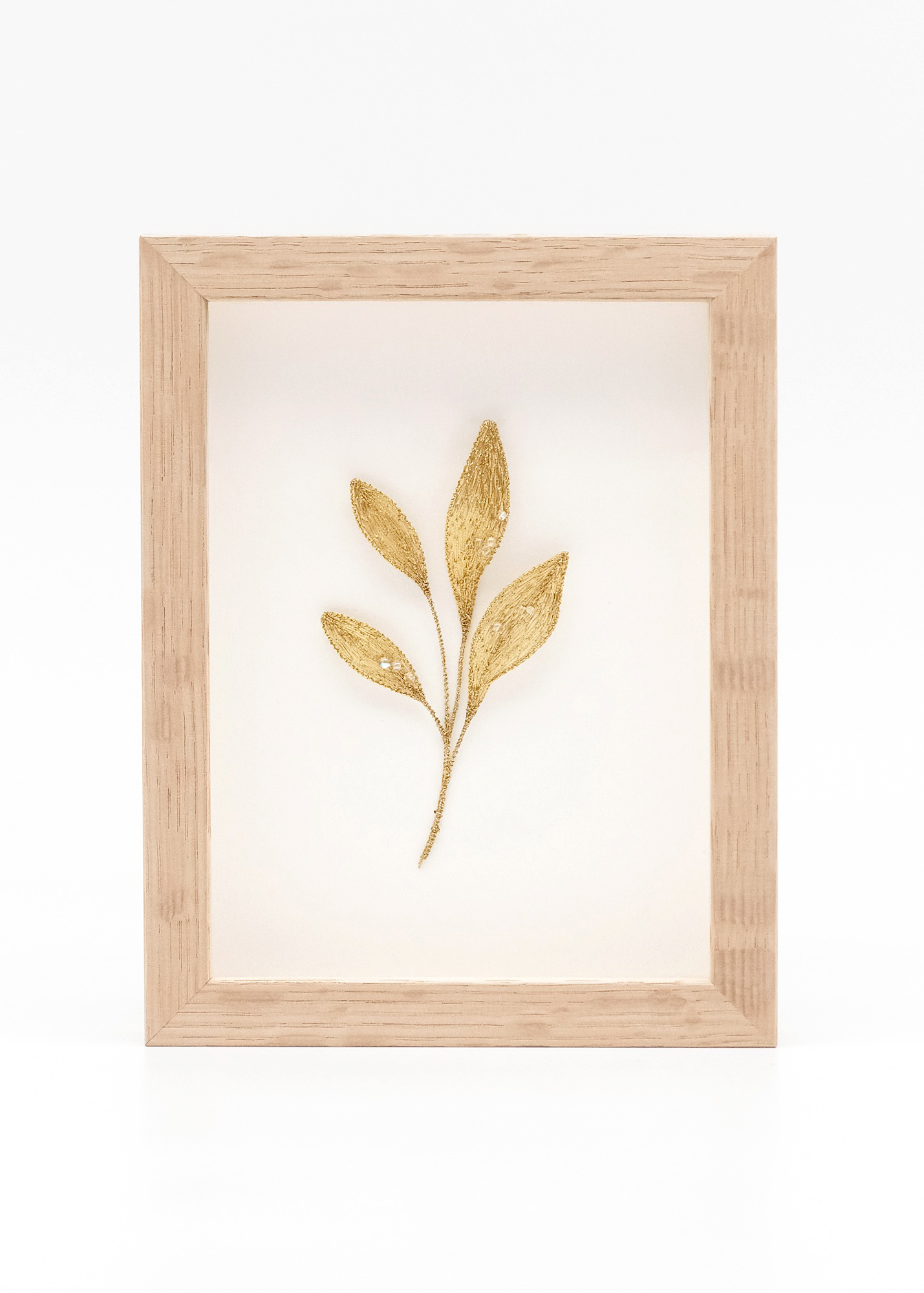 Orée n°6 évoque une feuille d’olivier. Une cueillette lumineuse à l’orée d’un sentier. Cette broderie invite à franchir la frontière d’un territoire encore inconnu mais accueillant, un jour de printemps où la nature s’éveille.
